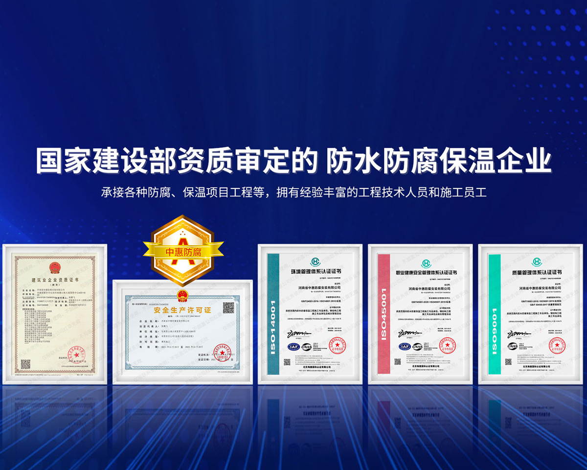 公司經營范圍:防水防腐保溫工程;消防設施工程;建筑裝修裝飾工程;建筑機電安裝工程;電力工程;建筑工程;石油化工工程;工業清洗工程;油罐清洗工程;鋼結構工程;環保工程;模板腳手架工程;電纜防火封堵、防污閃噴涂、外墻外保溫工程;各類施工勞務作業;設備維修、船舶鉚焊、涂裝;電力工程材料、建材、防水材料、防火材料、防腐保溫材料銷售,并相繼通過了GB/T19001-2008idtISO9001:2008GB/T50430-2007質量管理體系認證證書。GB/T24001-2004idtISO14001:2004環境管理體系認證證書。GB/T28001-2011idtOHSAS18001:2007職業健康安全管理體系認證證書。公司是中國防腐蝕于防護協會、中國施工企業管理協會、電力協會和中國鋼結構防水協會會員單位。 公司的經營業務涵蓋了石油、化工、電力、冶金、煤炭、船舶、國防、燃氣、水利、環保、交通運輸、航空及國防軍工和輕紡市政等行業的防腐保溫絕熱設備。鋼結構安裝、防火、防水、金屬噴鍍、聚脲噴繪、陰極保護、防滲透堵漏、玻璃鋼及各種磚版材料襯里、橡膠襯里、煙氣硫和耐酸溶劑腐蝕等工程施工。公司連續十年榮獲“省市先進施工企業”“安全生產先進單位”“重合同,守信用企業”和“AA***資質企業”的稱號。2000年被命名為市級文明單位,2002年被國家工商行政管理局命名為“重合同,守信用的企業”、被中國工業防腐蝕技術協會命名為“防腐蝕企業,能源節約及環境保護領域有豐富的經驗和***的業績。工程一次交驗合格率100%。其中攀枝花鋼鐵公司煉鐵廠四號高爐及熱風爐防腐工程、上海寶鋼公司煤氣柜防腐工程、撫順石油一廠裝置防腐項目、齊魯石化公司稀烴廠高塔防腐工程、吉林化學工業公司煉油廠油罐防腐工程、天津石化熱電廠六號爐頂棚聯絡管保溫工程、大慶油田(太倉)力神泵業工程、中國化學工程第十一建設工程、中原油田勘探局工程、中國石化銷售有限公司華北分部、魯皖輸油管道工程、貴州開磷息烽合成氨工程、陜西黃陵煤化工程、中國石油天然氣西部管道塔里木輸油工程、邯鋼集團邯寶鋼鐵公司煉鐵工程、德州供電工程、吉寶(南通)船廠工程,偃師華潤熱力工程、鄭州熱力總公司。 河南省中惠防腐安裝有限公司愿以豐富的施工經驗,***的技術,***的設備,***的管理,***的服務,竭誠為國內外廣大的用戶提供***滿意、******的工程作品。 我公司愿與國內外同仁一道,團結協作,共同推進防腐蝕行業發展! 公司地址:河南省長垣縣建設路北段360號 固定電話:0373-8866488 郵編:453400 網址:http://www_zhff_com_cn.zhongguoranqi.com